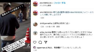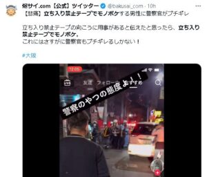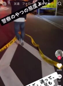 事故現場にある立ち入り禁止テープでモノボケする男性が警察官に怒鳴られている動画が話題となっています。
