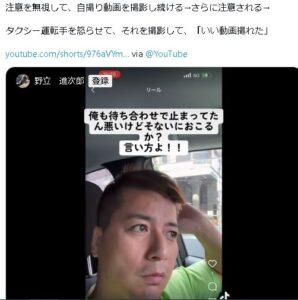 野立進次郎氏は今回の出入り禁止テープ、前回のタクシー専用道路停止動画など、他にも迷惑動画を多数アップしています。